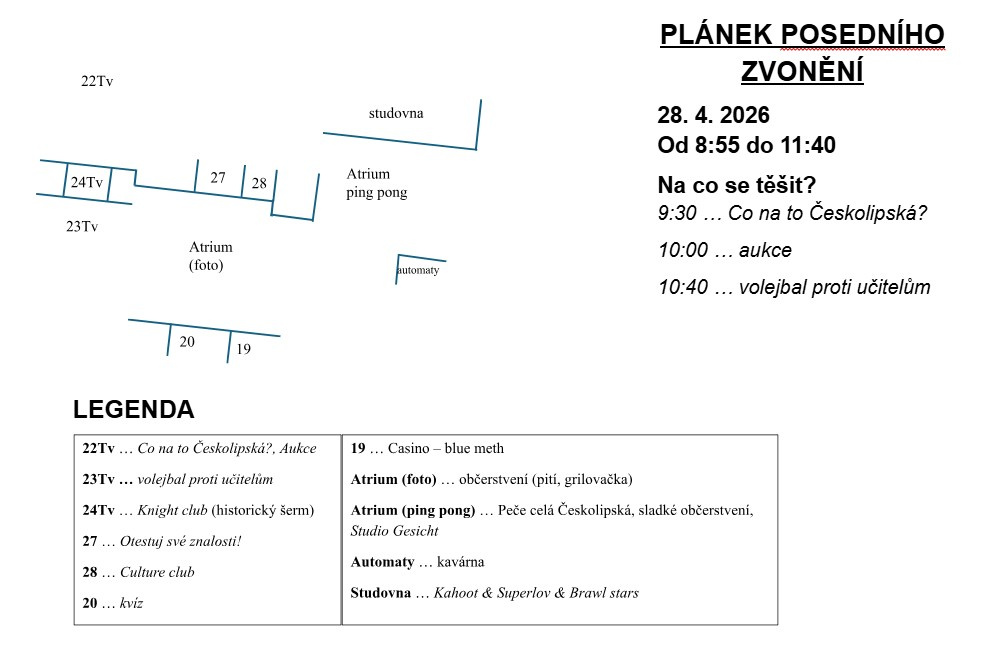 Přijďte 28. 4. 2026 na naše poslední zvonění. Od 8:55 se na vás budeme těšit v přízemním patře naší školy! Nezapomeňte si s sebou vzít tučnou finanční výbavu, protože zábavy i jídla bude mnoho, s nárůstem inflace však nic nemůže být zadarmo! ;)